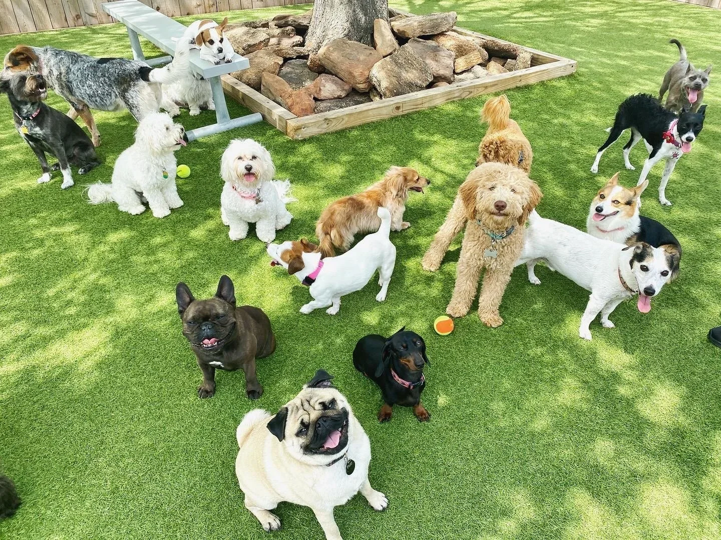Wag’n World is expertly managed with professional, highly trained, and compassionate staff members attending to your pups 24/7. All management is certified in First Aid and CPR. Full transparency and consistent communication is a given! Three separate group sizes featuring Small, Medium, and Big dog play groups. Cage-free play ALL DAY with huge climate-controlled indoor play spaces. Expansive, turfed, and shaded outdoor play yards where your dog can run, romp, and wrestle with their best buddies. High capacity accommodations for Boarding that includes Daycare. That’s right, FREE Daycare INCLUDED with your pups Boarding stay! Catch the best angles and action shots on our many live cameras in all of the play spaces.