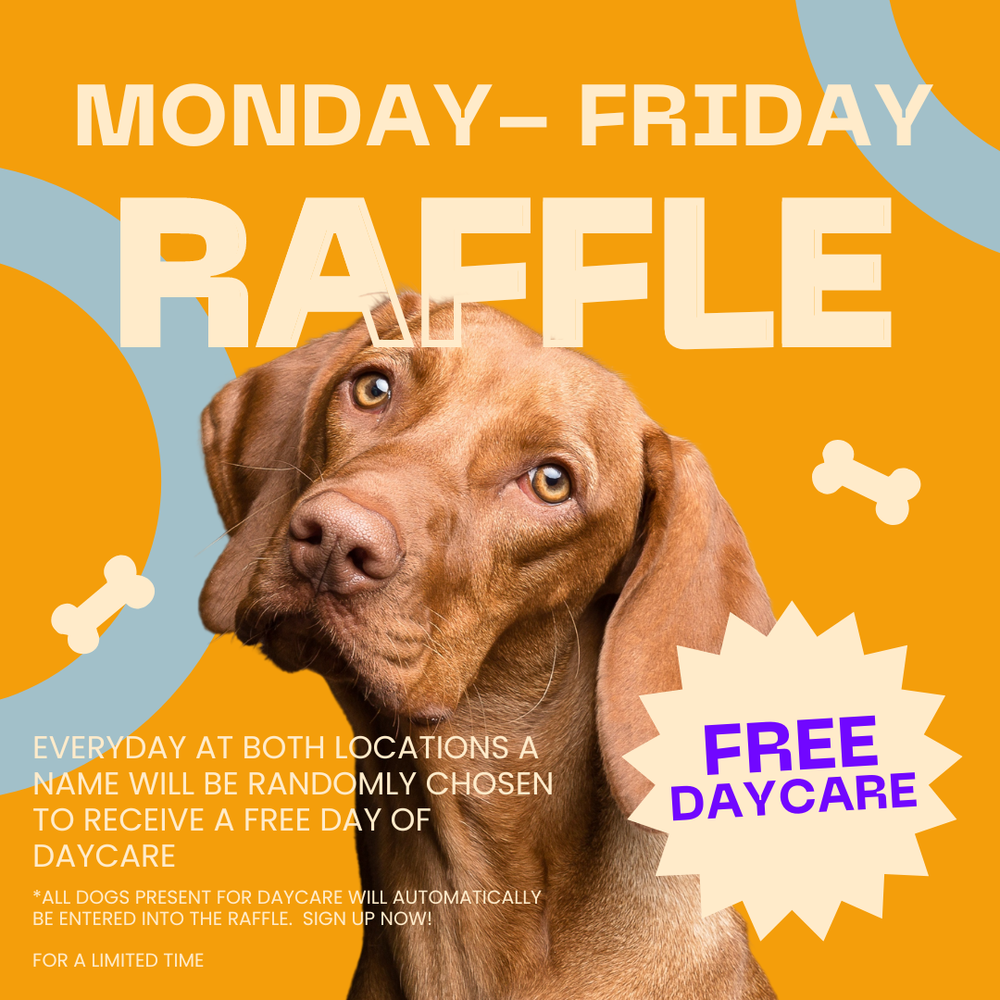 FREE Daycare Raffle *NEW* - Starting Monday, September the 23rd, we are introducing our limited time daily raffle drawing Monday - Friday. If your dog is checked in for daycare, they are automatically entered to win a FREE day of daycare to use at anytime. Could be used the day they win, or you can save it for a future day of daycare. The choice is up to you!
